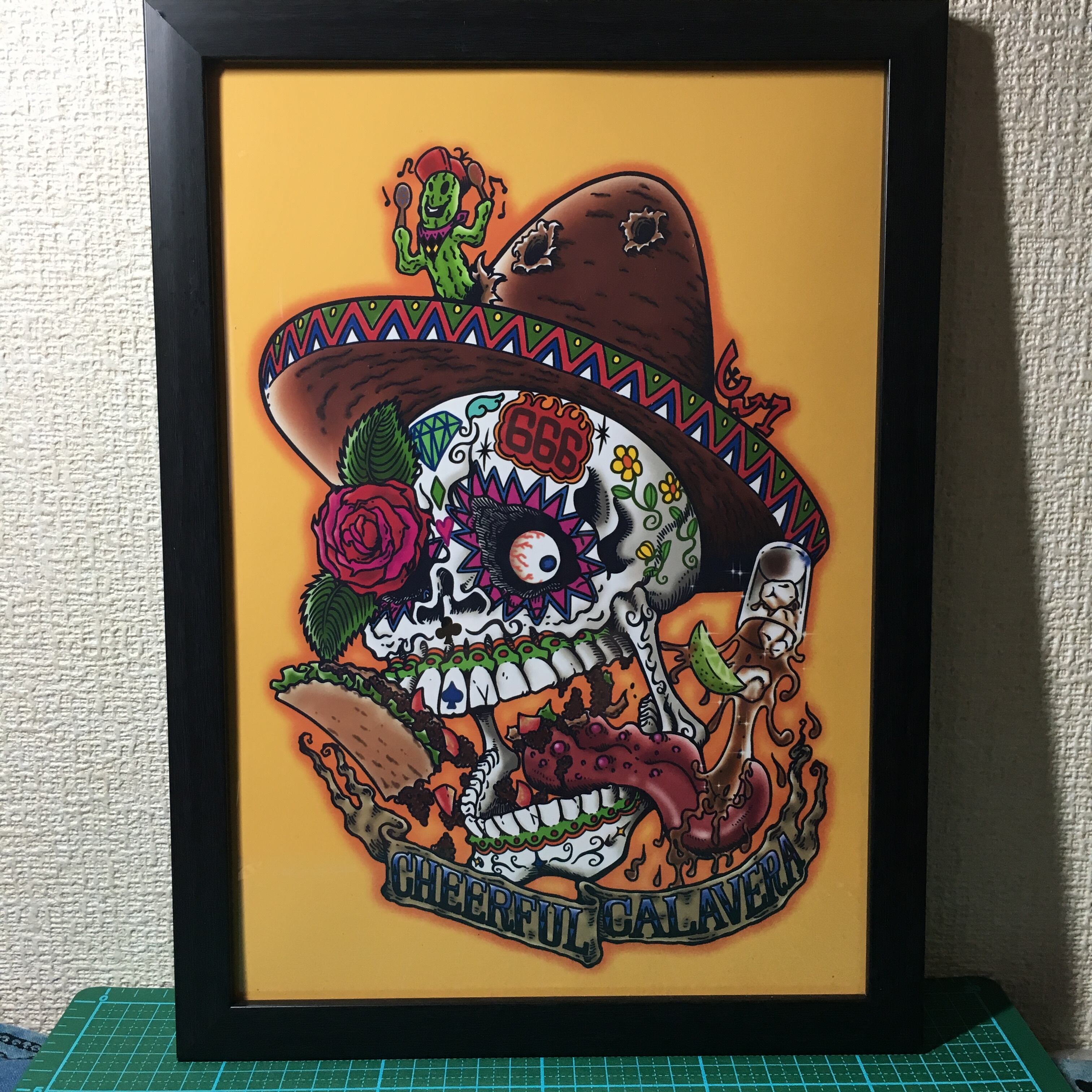 イラストは「Cheerful Calavera = 陽気なメキシカンドクロ」をモチーフにA4サイズのイラストにボード付きです。
